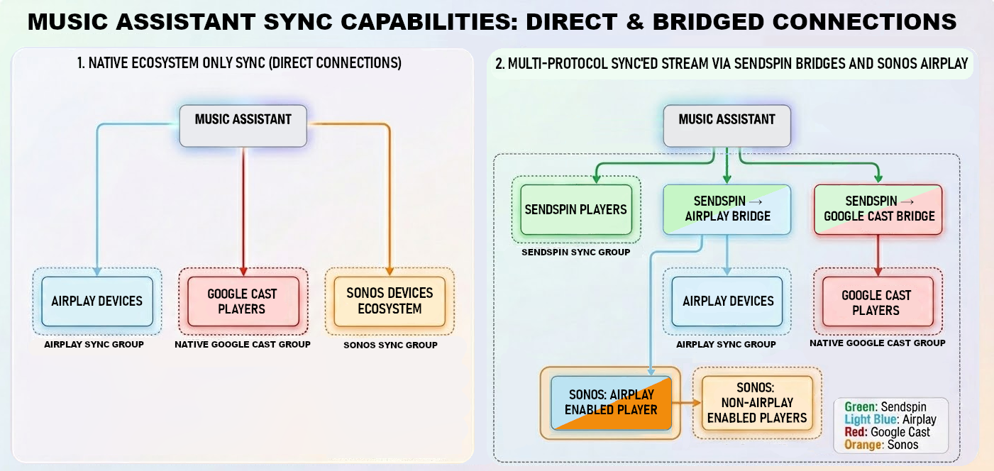 For temporary and permanent sync groups the protocol linking feature and Sendspin bridges available to Music Assistant lead to powerful options for group creation. The Sendspin bridges create a link between the Sendspin protocol, and the AirPlay and Google Cast protocols which allows for creation of groups of different provider types which will all play in sync. For users with Sonos devices with AirPlay functionality then this will further allow Sonos devices to also be played in sync. Even more impressively, Sonos devices without AirPlay functionality can be grouped with a player that does and then that player grouped to an AirPlay group. All of this functionality is illustrated in the following diagram. On the left is the traditional model where each provider type is isolated (and this remains the case for many of the providers available in MA) and then on the left is shown the potential broad linking of disparate types that is available across the Sendspin, AirPlay, Google Cast and Sonos ecosystems.