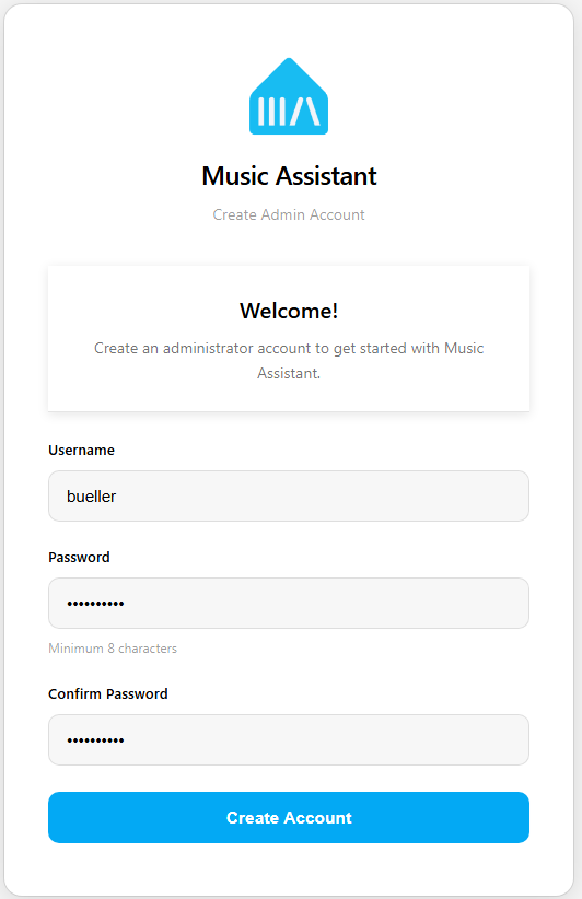 Section titled “Initial Authentication Setup”Access to the Music Assistant User Interface (UI) requires a login and password.