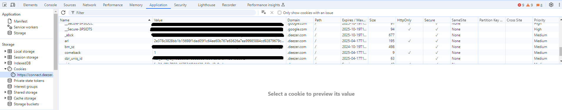 >>button - Under Storage > Cookies, click “https://www.deezer.com” and find the entry labelled “arl”